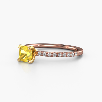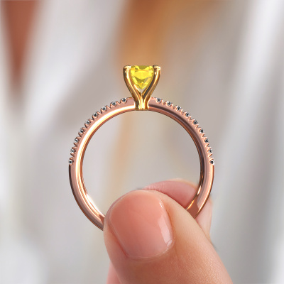 The ring shown above is called the Crystal CUS 2. We call this type of ring a pavé solitaire ring because it has one centre gemstone and a band that is also pave set with gemstones. The 14 Carat rose gold engagement ring is set with a cushion 5 mm yellow sapphire centre stone and the band is pave set with diamond gemstones. Each jewel is made just for you by our master goldsmiths in our own studio.This classic rose gold pavé solitaire engagement ring has an exquisite cushion yellow sapphire centre stone. To further accentuate the centre stone, the band is fully set with more diamonds. Its open prong setting allows light to strike the yellow sapphire from various angles and this adds sparkle to your yellow sapphire ring. The photo shown above depicts the goldsmith's carefully handcrafted details of the ring. The high positioning of the centre stone is truly eye-catching. The perfect engagement ring for the crown jewel of your life! After receiving your order, our goldsmiths will start the creative process of making your Crystal CUS 2 engagement ring. We don't keep stock. This is advantageous because these costs will not be passed on to you. Therefore, we can offer jewellery at exceptionally low prices.Different styles of new rings are made daily by our team. Perhaps you have found a pavé solitaire engagement ring somewhere. One you would like to give to your loved one. Please feel free to share your thoughts and design with our jewel designers. We would love to turn your design into a classic engagement ring. You can follow the development of your ring design because we use very detailed 3D drawings. On top of that, you can order a dummy of the design. A dummy is a plastic ring, which can be shaped according your ring design. You can try it on and check if the engagement ring is up to standard. We will gladly send you a non-binding offer, based on a fair price/ quality ratio. The offer will baffle you, considering the quality of the ring and gemstones.To make it easier for you, we offer a 30 day return policy. Check our terms and conditions.
