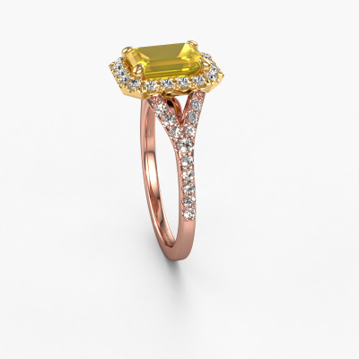 The ring shown above is called the Kimber EME. We call this type of ring a pavé solitaire ring because it has one centre gemstone and a band that is also pave set with gemstones. The 14 Carat rose gold engagement ring is set with a emerald cut 8x6 mm yellow sapphire centre stone and the band is pave set with lab grown diamond gemstones. Each jewel is made by a team of passionate goldsmiths and jewel designers. This will make your crown jewel truly eye-catching.This exclusive rose gold pavé solitaire engagement ring has an exquisite emerald cut yellow sapphire centre stone. To further accentuate the centre stone, the band is fully set with more lab-grown diamonds. Its open prong setting allows light to strike the yellow sapphire from various angles and this adds sparkle to your yellow sapphire ring. The photo shown above depicts the goldsmith's carefully handcrafted details of the ring. The high positioning of the centre stone is truly eye-catching. The perfect engagement ring for the crown jewel of your life! By using a combination of the latest modern techniques, combined with ancient crafting, we can make all our engagement rings in our own studio. Each jewel is made to order. This is advantageous because we can offer you a price you won't find anywhere else.Our team adds new designs to our online collection daily. Our designers and goldsmiths work together in creating the best design. We strive to offer a diverse collection of jewels. Perhaps you have a specific jewel design in mind. One you came across somewhere. Please contact us for a free consultation. We will make you an offer, based on a fair price/ quality ratio, that will baffle you.To make it easier for you, we offer a 30 day return policy. Check our terms and conditions.