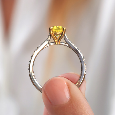 The ring shown above is called the Mignon rnd 2. We call this type of ring a pavé solitaire ring because it has one centre gemstone and a band that is also pave set with gemstones. The 14 Carat white gold engagement ring is set with a round 6 mm yellow sapphire centre stone and the band is pave set with lab grown diamond gemstones. Each jewel is made by a team of passionate goldsmiths and jewel designers. This will make your crown jewel truly eye-catching.This luxury white gold pavé solitaire engagement ring has an exquisite round yellow sapphire centre stone. To further accentuate the centre stone, the band is fully set with more lab-grown diamonds. Its open prong setting allows light to strike the yellow sapphire from various angles and this adds sparkle to your yellow sapphire ring. The photo shown above depicts the goldsmith's carefully handcrafted details of the ring. The high positioning of the centre stone is truly eye-catching. The perfect engagement ring for the crown jewel of your life! By using our modern techniques, we can design and customize the finest quality jewels with the utmost care for you. Our engagement rings are always priced 30 percent lower than other jewellers. We make engagement rings to order so we don't have to maintain a large stock. If you have a certain budget, we are more than happy to advice you accordingly.Different styles of new rings are made daily by our team. Perhaps you have found a pavé solitaire engagement ring somewhere. One you would like to give to your loved one. Please feel free to share your thoughts and design with our jewel designers. We would love to turn your design into a luxury engagement ring. You can follow the development of your ring design because we use very detailed 3D drawings. On top of that, you can order a dummy of the design. A dummy is a plastic ring, which can be shaped according your ring design. You can try it on and check if the engagement ring is up to standard. We will gladly send you a non-binding offer, based on a fair price/ quality ratio. The offer will baffle you, considering the quality of the ring and gemstones.To make it easier for you, we offer a 30 day return policy. Check our terms and conditions.