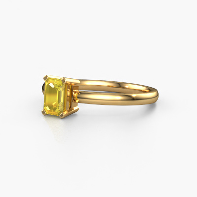 The ring shown above is called the Denita 1 EME, we call this a solitaire ring because it contains a single gemstone. The engagement ring is made in 14 Carat gold and has a emerald cut yellow sapphire of 6x4 mm. The cool thing about our configurator is that you can compile your own piece of jewellery, into a completely personalized one. This solitaire ring is crafted in the precious metals gold with gold, but of course you are free to pick your own colours. Each piece of jewellery is made by a team of passionate goldsmiths and jewel designers. This will make your crown jewel truly eye-catching.The solitaire ring is a special type of engagement ring. Its open prong setting allows light to strike the gemstone from various angles. This contemporary engagement ring is a stunning eye-catcher because of the high positioning of the gemstone. In order for you to commemorate your proposal with a unique ring, we carefully adorn this solitaire ring by hand. The love of your life deserves nothing but the best. By using a combination of the latest modern techniques, combined with ancient crafting, we can make all our engagement rings in our own studio. Each jewel is made to order. This is advantageous because we can offer you a price you won't find anywhere else.Our team adds new designs to our online collection daily. Our designers and goldsmiths work together in creating the best design. We strive to offer a diverse collection of jewels. Perhaps you have a specific jewel design in mind. One you came across somewhere. Please contact us for a free consultation. We will make you an offer, based on a fair price/ quality ratio, that will baffle you.To make it easier for you, we offer a 30 day return policy. Check our terms and conditions.