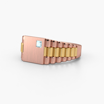 Everyone knows the design of this well-known watch brand. With two colours of rose gold links, this solid 14 Carat rose gold Pelle men's ring, is perfectly suited for trendy, successful men. A man who wants to dress to impress with a striking men's ring with 3 mm aquamarine. Show them what you are made of!The best part of this royal men's ring is that you can customize it to your own liking. Your style, your choice, your men's ring. On top of that, your luxury rose gold men's ring will be made by hand with eco-friendly materials! Please feel free to easily customize the ring, using our online tool. Of course, you can always contact us. We will gladly help you compiling your luxury men's ring. Is there a design you like, but you would like to customize it with a gemstone we do not offer on our website, then please contact us. We're happy to tell you about the possibilities.Our team of talented, passionate designers add new ring designs to our online collection daily. Our objective in doing so, is to be able to offer you a wide variety of jewels. Please feel free to request a quote if you have specific wishes for your ring. We guarantee to make you an offer you can't refuse.After receiving your order, our goldsmiths will start the creative process of making your Pelle ring. We don't keep stock. This is advantageous because these costs will not be passed on to you. Therefore, we can offer jewellery at exceptionally low prices.To make it easier for you, we offer a 30 day return policy. Check our terms and conditions.