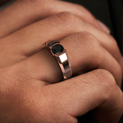 Are you looking for a modern rose gold men's ring that is slightly different? Then our rectangular rose gold black diamond set Indigo men's ring is the perfect ring for you! This ring, as shown here, is made of rose gold but feel free to customize to your liking. Show them what you are all about with this rose gold black diamonds Indigo men's ring, a ring for ambitious men. How do you like this modern rose gold men's ring? Simply customize this Indigo men's ring, using our online tool. Subsequently, your personal best prices Indigo men's ring will be made by hand by our goldsmiths. Precious metals and gemstones can be customized to your liking. Do you have specific preferences which are unavailable in our online tool? Please feel free to contact us. We will customize your personal modern men's ring to your liking.Our team of talented, passionate designers add new ring designs to our online collection daily. Our objective in doing so, is to be able to offer you a wide variety of jewels. Please feel free to request a quote if you have specific wishes for your ring. We guarantee to make you an offer you can't refuse.By using a combination of the latest modern techniques, combined with ancient crafting, we can make all our rings in our own studio. Each jewel is made to order. This is advantageous because we can offer you a price you won't find anywhere else.To make it easier for you, we offer a 30 day return policy. Check our terms and conditions.