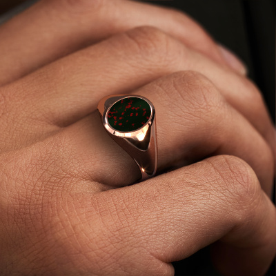 The solid Herman 1 pinky ring with oval shape bloodstone stone top, as shown above, is filled with tradition. Customary, the pinky ring was passed down from father to son. Start your own tradition with this solid rose gold pinky ring. We are also more than happy to engrave your ring with a monogram or family crest. Please check our database for further inquiries and options. You can find the departments of our education centre at the bottom of this page. Start a new tradition with the traditional rose gold Herman 1 pinky ring. As soon as you finished designing your Herman 1 signet ring with our online tool, our goldsmiths will start their creative process of making your ring. This will be done with passion and care, according ancient crafting. On top of that, our jewels are made of eco-friendly materials. Simply customize online with our online tool, if you want any changes made. If you want specific changes made to your Herman 1 signet ring, that are unavailable in our online tool, please feel free to contact our expert designers.