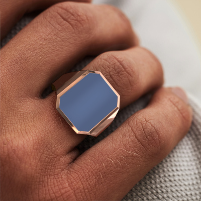 The solid Lars 5 signet ring with octagon blue sardonyx stone top, as shown above, is filled with tradition. Customary, the signet ring was passed down from father to son. Start your own tradition with this solid rose gold signet ring. We are also more than happy to engrave your ring with a monogram or family crest. Please check our database for further inquiries and options. You can find the departments of our education centre at the bottom of this page. Start a new tradition with the chic rose gold Lars 5 signet ring. The luxury Lars 5 signet ring, as shown here, can be customized to your liking. Our online tool offers many different options but please feel free to contact us if you want changes made to your Lars 5 signet ring, which are unavailable in our online tool.New jewellery designs are added to our online collection daily. Our team of passionate designers strive to create extraordinary and diverse designs. Have you seen a ring you like? Please feel free to contact us. Based on a good price/ quality ratio, we will make you an offer you can't refuse!Because we design and deliver our own rings, we can offer you a ring at a price you won't find anywhere else. A ring is made to order, which helps prevent excess supplies, so we can make you a great price offer. We understand it feels risky, buying your ring online, but we will gladly assist in the designing process, taking your budget into consideration.To make it easier for you, we offer a 30 day return policy. Check our terms and conditions.