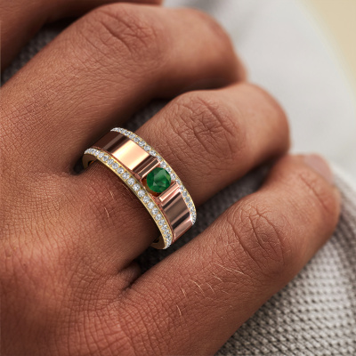 Are you looking for a exclusive rose gold men's ring that is slightly different? Then our straight rose gold emerald set Danillo men's ring is the perfect ring for you! This ring, as shown here, is made of rose gold but feel free to customize to your liking. Show them what you are all about with this rose gold emerald Danillo men's ring, a ring for ambitious men. The luxury Danillo men's ring, as shown here, can be customized to your liking. Our online tool offers many different options but please feel free to contact us if you want changes made to your Danillo men's ring, which are unavailable in our online tool.Our team of talented, passionate designers add new ring designs to our online collection daily. Our objective in doing so, is to be able to offer you a wide variety of jewels. Please feel free to request a quote if you have specific wishes for your ring. We guarantee to make you an offer you can't refuse.Are you on a budget? Please feel free to contact us, so we can go discuss your options. We offer our rings at guaranteed best price, because we make them to order. You won't find such a price anywhere else!To make it easier for you, we offer a 30 day return policy. Check our terms and conditions.