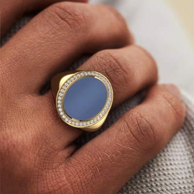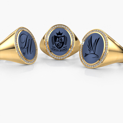 The solid Adam 4 signet ring with oval shape blue sardonyx stone top, as shown above, is filled with tradition. Customary, the signet ring was passed down from father to son. Start your own tradition with this solid gold signet ring. We are also more than happy to engrave your ring with a monogram or family crest. Please check our database for further inquiries and options. You can find the departments of our education centre at the bottom of this page. Start a new tradition with the exclusive gold Adam 4 signet ring. The best part of this luxury signet ring is that you can customize it to your own liking. Your style, your choice, your signet ring. On top of that, your exclusive gold signet ring will be made by hand with eco-friendly materials! Please feel free to easily customize the ring, using our online tool. Of course, you can always contact us. We will gladly help you compiling your exclusive signet ring. Is there a design you like, but you would like to customize it with a gemstone we do not offer on our website, then please contact us. We're happy to tell you about the possibilities.Our team of talented, passionate designers add new ring designs to our online collection daily. Our objective in doing so, is to be able to offer you a wide variety of jewels. Please feel free to request a quote if you have specific wishes for your ring. We guarantee to make you an offer you can't refuse.After receiving your order, our goldsmiths will passionately start the creative process of making your ring in our own studio. Because we don't have a big stockpile, these costs will not be passed on to you. Our pricing is proof of that! We offer top quality jewels at lowest price, guaranteed.To make it easier for you, we offer a 30 day return policy. Check our terms and conditions.