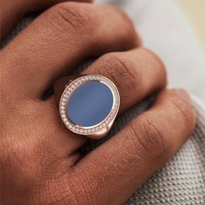 The solid Adam 4 signet ring with oval shape blue sardonyx stone top, as shown above, is filled with tradition. Customary, the signet ring was passed down from father to son. Start your own tradition with this solid rose gold signet ring. We are also more than happy to engrave your ring with a monogram or family crest. Please check our database for further inquiries and options. You can find the departments of our education centre at the bottom of this page. Start a new tradition with the exclusive rose gold Adam 4 signet ring. The best part of this luxury signet ring is that you can customize it to your own liking. Your style, your choice, your signet ring. On top of that, your exclusive rose gold signet ring will be made by hand with eco-friendly materials! Please feel free to easily customize the ring, using our online tool. Of course, you can always contact us. We will gladly help you compiling your exclusive signet ring. Is there a design you like, but you would like to customize it with a gemstone we do not offer on our website, then please contact us. We're happy to tell you about the possibilities.Our team of talented, passionate designers add new ring designs to our online collection daily. Our objective in doing so, is to be able to offer you a wide variety of jewels. Please feel free to request a quote if you have specific wishes for your ring. We guarantee to make you an offer you can't refuse.After receiving your order, our goldsmiths will passionately start the creative process of making your ring in our own studio. Because we don't have a big stockpile, these costs will not be passed on to you. Our pricing is proof of that! We offer top quality jewels at lowest price, guaranteed.To make it easier for you, we offer a 30 day return policy. Check our terms and conditions.