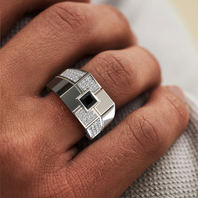 Dress to impress with this rectangular Rogier men's ring, because with the right ring you make a strong personal statement. This Rogier cool men's ring is shown in platinum. If this doesn't suit your style, feel free to customize the precious metal to your liking. After all, you want a men's ring that matches your style. A ring that truly suits you. One saying: This is who I am!The cool Rogier men's ring, as shown here, can be customized to your liking. Our online tool offers many different options but please feel free to contact us if you want changes made to your Rogier men's ring, which are unavailable in our online tool.Our talented designers add new designs to our online collection daily. Together they create a diverse collection of the finest jewellery. If you prefer to make a ring according your own design, please feel free to request a quote. We will make you an amazing offer, based on quality and price.After receiving your order, our goldsmiths will start the creative process of making your Rogier ring. We don't keep stock. This is advantageous because these costs will not be passed on to you. Therefore, we can offer jewellery at exceptionally low prices.To make it easier for you, we offer a 30 day return policy. Check our terms and conditions.
