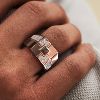 Dress to impress with this rectangular Rogier men's ring, because with the right ring you make a strong personal statement. This Rogier cool men's ring is shown in 14 Carat rose gold. If this doesn't suit your style, feel free to customize the precious metal to your liking. After all, you want a men's ring that matches your style. A ring that truly suits you. One saying: This is who I am!The cool Rogier men's ring, as shown here, can be customized to your liking. Our online tool offers many different options but please feel free to contact us if you want changes made to your Rogier men's ring, which are unavailable in our online tool.Our talented designers add new designs to our online collection daily. Together they create a diverse collection of the finest jewellery. If you prefer to make a ring according your own design, please feel free to request a quote. We will make you an amazing offer, based on quality and price.After receiving your order, our goldsmiths will start the creative process of making your Rogier ring. We don't keep stock. This is advantageous because these costs will not be passed on to you. Therefore, we can offer jewellery at exceptionally low prices.To make it easier for you, we offer a 30 day return policy. Check our terms and conditions.