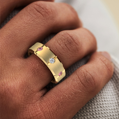 Dress to impress with this flat Irwin men's ring, because with the right ring you make a strong personal statement. This Irwin edgy men's ring is shown in 14 Carat gold. If this doesn't suit your style, feel free to customize the precious metal to your liking. After all, you want a men's ring that matches your style. A ring that truly suits you. One saying: This is who I am!How do you like this modern gold men's ring? Simply customize this Irwin men's ring, using our online tool. Subsequently, your personal edgy Irwin men's ring will be made by hand by our goldsmiths. Precious metals and gemstones can be customized to your liking. Do you have specific preferences which are unavailable in our online tool? Please feel free to contact us. We will customize your personal modern men's ring to your liking.