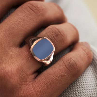 The flat Benjamin 2 signet ring with rectangle antique blue sardonyx stone top, as shown above, is filled with tradition. Customary, the signet ring was passed down from father to son. Start your own tradition with this flat rose gold signet ring. We are also more than happy to engrave your ring with a monogram or family crest. Please check our database for further inquiries and options. You can find the departments of our education centre at the bottom of this page. Start a new tradition with the modern rose gold Benjamin 2 signet ring. Our goldsmiths passionately create your customized signet ring to your liking with the utmost care. The rose gold signet ring, as shown here, can be customized using our online tool. Feel free to ask our jewel designers for assistance if you want changes made which are unavailable in our online tool. We are happy to answer your questions.New jewellery designs are added to our online collection daily. Our team of passionate designers strive to create extraordinary and diverse designs. Have you seen a ring you like? Please feel free to contact us. Based on a good price/ quality ratio, we will make you an offer you can't refuse!Are you on a budget? Please feel free to contact us, so we can go discuss your options. We offer our rings at guaranteed best price, because we make them to order. You won't find such a price anywhere else!To make it easier for you, we offer a 30 day return policy. Check our terms and conditions.