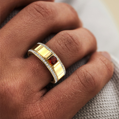 Are you looking for a exclusive gold men's ring that is slightly different? Then our straight gold garnet set Danillo men's ring is the perfect ring for you! This ring, as shown here, is made of gold but feel free to customize to your liking. Show them what you are all about with this gold garnet Danillo men's ring, a ring for ambitious men. The luxury Danillo men's ring, as shown here, can be customized to your liking. Our online tool offers many different options but please feel free to contact us if you want changes made to your Danillo men's ring, which are unavailable in our online tool.Our team of talented, passionate designers add new ring designs to our online collection daily. Our objective in doing so, is to be able to offer you a wide variety of jewels. Please feel free to request a quote if you have specific wishes for your ring. We guarantee to make you an offer you can't refuse.Are you on a budget? Please feel free to contact us, so we can go discuss your options. We offer our rings at guaranteed best price, because we make them to order. You won't find such a price anywhere else!To make it easier for you, we offer a 30 day return policy. Check our terms and conditions.