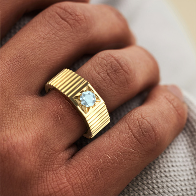 For the contemporary, stylish man that likes a bit of extravagance, we offer the heavy 14 Carat gold Elias pinky ring with aquamarine. Traditionally a pinky ring was worn as a sign of wealth. That is why a pink ring is perfectly suited for men who want to stand out. How do you like this modern gold men's ring? Simply customize this Elias men's ring, using our online tool. Subsequently, your personal best prices Elias men's ring will be made by hand by our goldsmiths. Precious metals and gemstones can be customized to your liking. Do you have specific preferences which are unavailable in our online tool? Please feel free to contact us. We will customize your personal modern men's ring to your liking.
