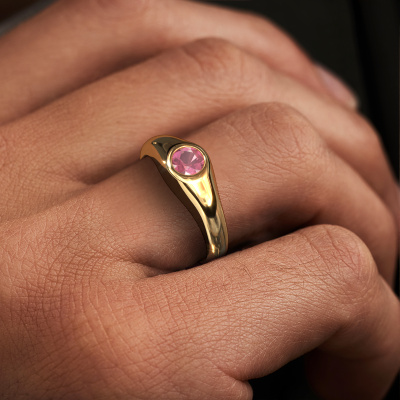For the contemporary, stylish man that likes a bit of extravagance, we offer the narrow 14 Carat gold Thorben pinky ring with tourmaline pink. Traditionally a pinky ring was worn as a sign of wealth. That is why a pink ring is perfectly suited for men who want to stand out. Our goldsmiths passionately create your customized men's ring to your liking with the utmost care. The gold men's ring, as shown here, can be customized using our online tool. Feel free to ask our jewel designers for assistance if you want changes made which are unavailable in our online tool. We are happy to answer your questions.