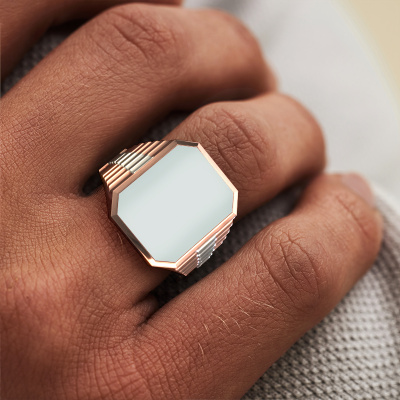 Everyone knows the design of this well-known watch brand. With two colours of rose gold links, this 2 Colours 14 Carat rose gold Brent 4 signet ring, is perfectly suited for trendy, successful men. A man who wants to dress to impress with a striking signet ring with 16x13 mm green sardonyx. Show them what you are made of!Customize your own luxury Brent 4 signet ring, which will then be created by our goldsmiths with great passion. Do you prefer a different option than is shown here in the rose gold Brent 4 signet ring? Then our online tools offers various options. Feel free to ask us for help if you are unable to succeed. We are happy to answer your questions!Our team of talented, passionate designers add new ring designs to our online collection daily. Our objective in doing so, is to be able to offer you a wide variety of jewels. Please feel free to request a quote if you have specific wishes for your ring. We guarantee to make you an offer you can't refuse.Are you on a budget? Please feel free to contact us, so we can go discuss your options. We offer our rings at guaranteed best price, because we make them to order. You won't find such a price anywhere else!To make it easier for you, we offer a 30 day return policy. Check our terms and conditions.
