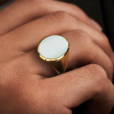 The heavy Herman 6 signet ring with oval shape green sardonyx stone top, as shown above, is filled with tradition. Customary, the signet ring was passed down from father to son. Start your own tradition with this heavy gold signet ring. We are also more than happy to engrave your ring with a monogram or family crest. Please check our database for further inquiries and options. You can find the departments of our education centre at the bottom of this page. Start a new tradition with the modern gold Herman 6 signet ring. How do you like this modern gold signet ring? Simply customize this Herman 6 signet ring, using our online tool. Subsequently, your personal cool Herman 6 signet ring will be made by hand by our goldsmiths. Precious metals and gemstones can be customized to your liking. Do you have specific preferences which are unavailable in our online tool? Please feel free to contact us. We will customize your personal modern signet ring to your liking.Our team of talented, passionate designers add new ring designs to our online collection daily. Our objective in doing so, is to be able to offer you a wide variety of jewels. Please feel free to request a quote if you have specific wishes for your ring. We guarantee to make you an offer you can't refuse.Because we design and deliver our own rings, we can offer you a ring at a price you won't find anywhere else. A ring is made to order, which helps prevent excess supplies, so we can make you a great price offer. We understand it feels risky, buying your ring online, but we will gladly assist in the designing process, taking your budget into consideration.To make it easier for you, we offer a 30 day return policy. Check our terms and conditions.