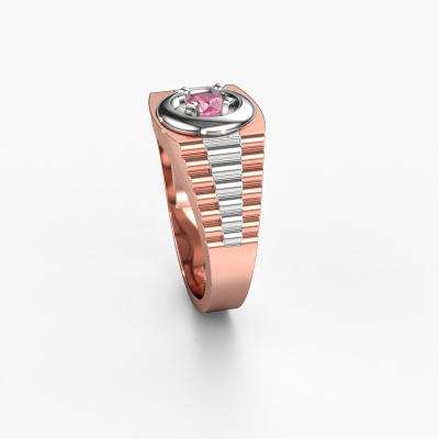 Everyone knows the design of this well-known watch brand. With two colours of rose gold links, this solid 14 Carat rose gold Edward men's ring, is perfectly suited for trendy, successful men. A man who wants to dress to impress with a striking men's ring with 4.7 mm pink sapphire. Show them what you are made of!How do you like this exclusive rose gold men's ring? Simply customize this Edward men's ring, using our online tool. Subsequently, your personal daring Edward men's ring will be made by hand by our goldsmiths. Precious metals and gemstones can be customized to your liking. Do you have specific preferences which are unavailable in our online tool? Please feel free to contact us. We will customize your personal exclusive men's ring to your liking.Our talented designers add new designs to our online collection daily. Together they create a diverse collection of the finest jewellery. If you prefer to make a ring according your own design, please feel free to request a quote. We will make you an amazing offer, based on quality and price.Because we design and deliver our own rings, we can offer you a ring at a price you won't find anywhere else. A ring is made to order, which helps prevent excess supplies, so we can make you a great price offer. We understand it feels risky, buying your ring online, but we will gladly assist in the designing process, taking your budget into consideration.To make it easier for you, we offer a 30 day return policy. Check our terms and conditions.