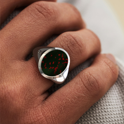 The solid Herman 4 signet ring with oval shape bloodstone stone top, as shown above, is filled with tradition. Customary, the signet ring was passed down from father to son. Start your own tradition with this solid platinum signet ring. We are also more than happy to engrave your ring with a monogram or family crest. Please check our database for further inquiries and options. You can find the departments of our education centre at the bottom of this page. Start a new tradition with the classic platinum Herman 4 signet ring. As soon as you finished designing your Herman 4 signet ring with our online tool, our goldsmiths will start their creative process of making your ring. This will be done with passion and care, according ancient crafting. On top of that, our jewels are made of eco-friendly materials. Simply customize online with our online tool, if you want any changes made. If you want specific changes made to your Herman 4 signet ring, that are unavailable in our online tool, please feel free to contact our expert designers.Our team of talented, passionate designers add new ring designs to our online collection daily. Our objective in doing so, is to be able to offer you a wide variety of jewels. Please feel free to request a quote if you have specific wishes for your ring. We guarantee to make you an offer you can't refuse.Are you on a budget? Please feel free to contact us, so we can go discuss your options. We offer our rings at guaranteed best price, because we make them to order. You won't find such a price anywhere else!To make it easier for you, we offer a 30 day return policy. Check our terms and conditions.