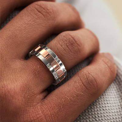 Everyone knows the design of this well-known watch brand. With two colours of rose gold links, this straight 14 Carat rose gold Ricardo 1 men's ring, is perfectly suited for trendy, successful men. A man who wants to dress to impress with a striking men's ring. Show them what you are made of!How do you like this trendy rose gold men's ring? Simply customize this Ricardo 1 men's ring, using our online tool. Subsequently, your personal affordable Ricardo 1 men's ring will be made by hand by our goldsmiths. Precious metals and gemstones can be customized to your liking. Do you have specific preferences which are unavailable in our online tool? Please feel free to contact us. We will customize your personal trendy men's ring to your liking.New jewellery designs are added to our online collection daily. Our team of passionate designers strive to create extraordinary and diverse designs. Have you seen a ring you like? Please feel free to contact us. Based on a good price/ quality ratio, we will make you an offer you can't refuse!Are you on a budget? Please feel free to contact us, so we can go discuss your options. We offer our rings at guaranteed best price, because we make them to order. You won't find such a price anywhere else!To make it easier for you, we offer a 30 day return policy. Check our terms and conditions.