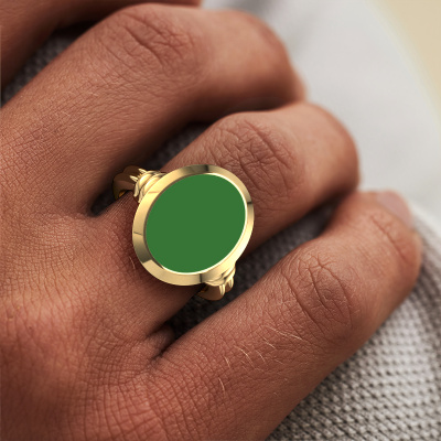 The solid Jake 3 signet ring with oval shape green enamel stone top, as shown above, is filled with tradition. Customary, the signet ring was passed down from father to son. Start your own tradition with this solid gold signet ring. We are also more than happy to engrave your ring with a monogram or family crest. Please check our database for further inquiries and options. You can find the departments of our education centre at the bottom of this page. Start a new tradition with the classic gold Jake 3 signet ring. The royal Jake 3 signet ring, as shown here, can be customized to your liking. Our online tool offers many different options but please feel free to contact us if you want changes made to your Jake 3 signet ring, which are unavailable in our online tool.Our talented designers add new designs to our online collection daily. Together they create a diverse collection of the finest jewellery. If you prefer to make a ring according your own design, please feel free to request a quote. We will make you an amazing offer, based on quality and price.By using a combination of the latest modern techniques, combined with ancient crafting, we can make all our rings in our own studio. Each jewel is made to order. This is advantageous because we can offer you a price you won't find anywhere else.To make it easier for you, we offer a 30 day return policy. Check our terms and conditions.