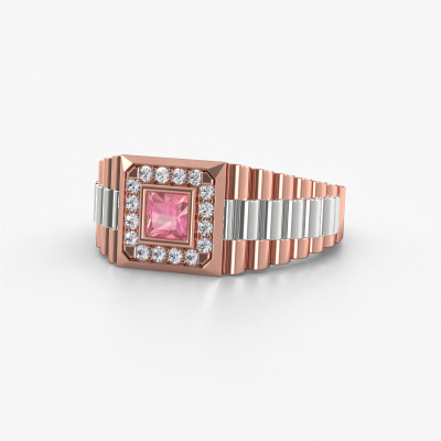 Everyone knows the design of this well-known watch brand. With two colours of rose gold links, this solid 14 Carat rose gold Zilan men's ring, is perfectly suited for trendy, successful men. A man who wants to dress to impress with a striking men's ring with 4 mm tourmaline pink. Show them what you are made of!Customize your own special Zilan men's ring, which will then be created by our goldsmiths with great passion. Do you prefer a different option than is shown here in the rose gold Zilan men's ring? Then our online tools offers various options. Feel free to ask us for help if you are unable to succeed. We are happy to answer your questions!Our team of talented, passionate designers add new ring designs to our online collection daily. Our objective in doing so, is to be able to offer you a wide variety of jewels. Please feel free to request a quote if you have specific wishes for your ring. We guarantee to make you an offer you can't refuse.After receiving your order, our goldsmiths will start the creative process of making your Zilan ring. We don't keep stock. This is advantageous because these costs will not be passed on to you. Therefore, we can offer jewellery at exceptionally low prices.To make it easier for you, we offer a 30 day return policy. Check our terms and conditions.