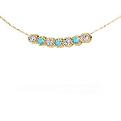 At DiamondsByMe, we create exclusive, extraordinary jewels. We use nothing but the finest precious metals and birthstones. This gold necklace is a true work of art! Patiently and passionately created to perfection by our goldsmith. The meticulous crafting of this ring requires a keen eye and skilled hand. And that is exactly what excites our goldsmiths! This fashionable extraordinary, exclusive pendant is proof of that. For maximum shine, these exquisite blue topaz are set by hand. This gives your necklace a glamorous appearance. The gold Kim 7 necklace, as shown above, is set with round blue topaz. What could possibly be more beautiful than a personally designed fashionable necklace, handmade by yours truly? Please, feel free to customize each model by choosing different precious metals and gemstones. This makes your necklace truly unique. This necklace can be customized to your liking. It goes without saying that you can also ask us for help. We are more than willing to assist in designing your Kim 7 fashionable necklace. If you like but still have specific wishes concerning customizing your design, such as adding a gemstone which isn't mentioned in the list, feel free to contact us. We will gladly inform you on different options.Our team of talented, passionate designers add new necklace designs to our online collection daily. Our objective in doing so, is to be able to offer you a wide variety of jewels. Please feel free to request a quote if you have specific wishes for your necklace. We guarantee to make you an offer you can't refuse.By using a combination of the latest modern techniques, combined with ancient crafting, we can make all our necklaces in our own studio. Each jewel is made to order. This is advantageous because we can offer you a price you won't find anywhere else.To make it easier for you, we offer a 30 day return policy. Check our terms and conditions.