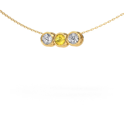 What a beautiful, contemporary necklace! A graceful pendant to finish your outfit. Buy it from DiamondsByMe. Our goldsmiths use the finest precious metals and gemstones to create our most extraordinary pieces of jewellery. Take this trendy gold yellow sapphire set Kim 3 necklace, for example. It was selected with great care, because your necklace should only be adorned with the finest yellow sapphire. Our goldsmith will make your pendant by hand and will set the yellow sapphire with great precision. Then it will be finished and polished to perfection, leaving you with a stunning pendant as a result!What could possibly be more beautiful than a personally designed trendy necklace, handmade by yours truly? Please, feel free to customize each model by choosing different precious metals and gemstones. This makes your necklace truly unique. This necklace can be customized to your liking. It goes without saying that you can also ask us for help. We are more than willing to assist in designing your Kim 3 trendy necklace. If you like but still have specific wishes concerning customizing your design, such as adding a gemstone which isn't mentioned in the list, feel free to contact us. We will gladly inform you on different options.Our team of talented, passionate designers add new necklace designs to our online collection daily. Our objective in doing so, is to be able to offer you a wide variety of jewels. Please feel free to request a quote if you have specific wishes for your necklace. We guarantee to make you an offer you can't refuse.By using a combination of the latest modern techniques, combined with ancient crafting, we can make all our necklaces in our own studio. Each jewel is made to order. This is advantageous because we can offer you a price you won't find anywhere else.To make it easier for you, we offer a 30 day return policy. Check our terms and conditions.
