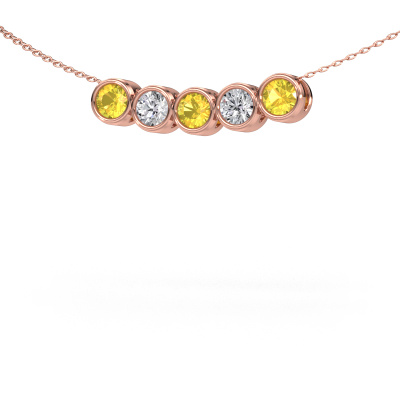 How would you describe your style? Do you like things slightly different? At the very least, this elegant rose gold necklace Kim 5 is unique, made especially by jewel designers. Our goldsmith will create your pendant to perfection by hand in our own artisan studio. This fashionable necklace is set with a yellow sapphire. These yellow sapphire are selected with great care because we believe your elegant necklace should be adorned with nothing less than the finest gemstones available. Wouldn't you agree?What could possibly be more beautiful than a personally designed fashionable necklace, handmade by yours truly? Please, feel free to customize each model by choosing different precious metals and gemstones. This makes your necklace truly unique. This necklace can be customized to your liking. It goes without saying that you can also ask us for help. We are more than willing to assist in designing your Kim 5 fashionable necklace. If you like but still have specific wishes concerning customizing your design, such as adding a gemstone which isn't mentioned in the list, feel free to contact us. We will gladly inform you on different options.