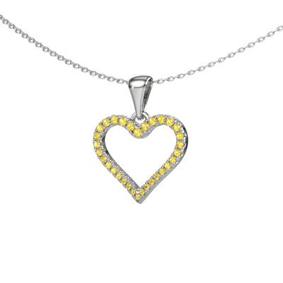 Let your heart speak with this gorgeous heart Heart 8 pendant. Made of white gold and adorned with the most beautiful yellow sapphire. Keep your loved one close to your heart, and have your heart shaped pendant crafted by the DiamondsByMe goldsmiths. This heart shaped pendant is an exquisite gift for a loved one, or yourself! This pendant is made by hand by our goldsmith in our own DiamondsByMe studio. Due to a unique combination of the latest modern techniques and ancient craftsmanship we are able to create your heart shaped pendant to perfection. And that is what excites our goldsmiths, because only the finest piece of jewellery will do! We also carefully select our yellow sapphire and each yellow sapphire of your heart shaped pendant is set with great care to create maximum shine. A uniquely handmade heart shaped pendant with a stunning yellow sapphire is what you end up with. A customized exclusive heart pendant is the perfect gift! New exquisite designs are added daily by our team of passionate goldsmiths. And each design can be customized. Simply customize the precious metals and the colour of gemstones which will be used, for example. This makes your design of the exclusive Heart 8 pendant truly unique!