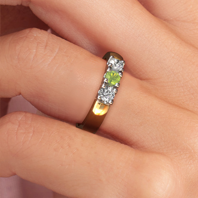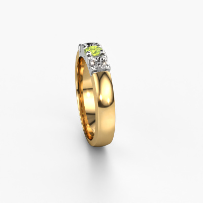 This extraordinary ring is called Rianne 3. This type of ring is known as a memoire ring, because its gemstones are set in a continuous line. This makes it easy to combine with other rings. The band of this 14 Carat gold ring is set in a combination of peridot and diamond 3.4 mm. You can easily choose the combination you prefer online. As you can see, a single peridot is set in this single alliance gold ring. The memoire ring represents collaboration. And that is precisely what these gemstones do, collaborate. Together they add a beautiful effect to the band of a classic ring! Such a meaningful ring, wouldn't you agree? All our hand selected peridot are positioned by hand by our expert goldsmith. It's a precise task, which can only be completed successfully through the combination of pure craftsmanship and usage of the latest techniques which give it an optimal effect. To create a perfect reflection of light, all the gemstones have to be perfectly aligned in the same way. During manufacturing, the expert goldsmith will therefore monitor the reflection of light constantly to check whether the peridot are aligned properly. This requires a skilled hand and a lot of patience but then the end product will be a true piece of art. And that is our mission!After receiving your order, our goldsmiths will passionately start the creative process of making your ring in our own studio. Because we don't have a big stockpile, these costs will not be passed on to you. Our pricing is proof of that! We offer top quality jewels at lowest price, guaranteed.Our team of talented, passionate designers add new ring designs to our online collection daily. Our objective in doing so, is to be able to offer you a wide variety of jewels. Please feel free to request a quote if you have specific wishes for your ring. We guarantee to make you an offer you can't refuse.To make it easier for you, we offer a 30 day return policy. Check our terms and conditions.