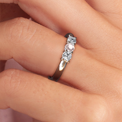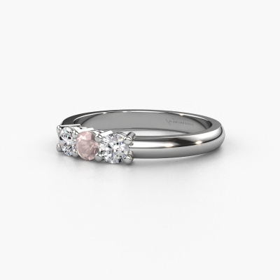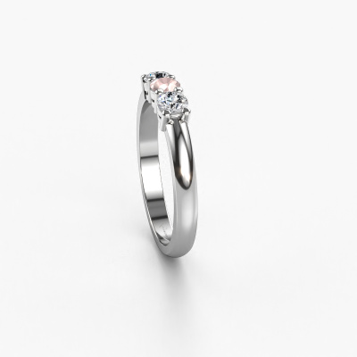 This extraordinary ring is called Michelle 3. This type of ring is known as a memoire ring, because its gemstones are set in a continuous line. This makes it easy to combine with other rings. The band of this platinum ring is set in a combination of morganite champagne and diamond 3 mm. You can easily choose the combination you prefer online. As you can see, a single morganite champagne is set in this single alliance platinum ring. The memoire ring represents collaboration. And that is precisely what these gemstones do, collaborate. Together they add a beautiful effect to the band of a classic ring! Such a meaningful ring, wouldn't you agree? All our hand selected morganite champagne are positioned by hand by our expert goldsmith. It's a precise task, which can only be completed successfully through the combination of pure craftsmanship and usage of the latest techniques which give it an optimal effect. To create a perfect reflection of light, all the gemstones have to be perfectly aligned in the same way. During manufacturing, the expert goldsmith will therefore monitor the reflection of light constantly to check whether the morganite champagne are aligned properly. This requires a skilled hand and a lot of patience but then the end product will be a true piece of art. And that is our mission!