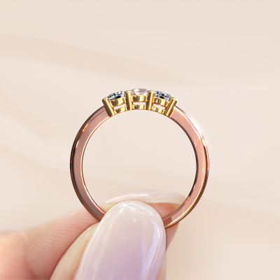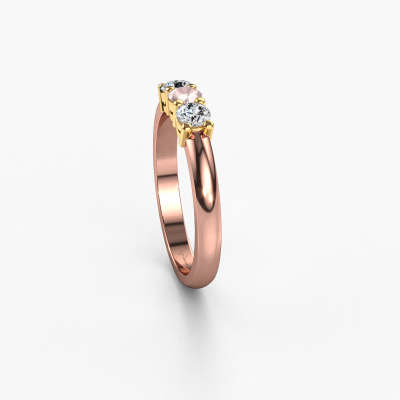 This extraordinary ring is called Michelle 3. This type of ring is known as a memoire ring, because its gemstones are set in a continuous line. This makes it easy to combine with other rings. The band of this 14 Carat rose gold ring is set in a combination of morganite champagne and diamond 3 mm. You can easily choose the combination you prefer online. As you can see, a single morganite champagne is set in this single alliance rose gold ring. The memoire ring represents collaboration. And that is precisely what these gemstones do, collaborate. Together they add a beautiful effect to the band of a classic ring! Such a meaningful ring, wouldn't you agree? All our hand selected morganite champagne are positioned by hand by our expert goldsmith. It's a precise task, which can only be completed successfully through the combination of pure craftsmanship and usage of the latest techniques which give it an optimal effect. To create a perfect reflection of light, all the gemstones have to be perfectly aligned in the same way. During manufacturing, the expert goldsmith will therefore monitor the reflection of light constantly to check whether the morganite champagne are aligned properly. This requires a skilled hand and a lot of patience but then the end product will be a true piece of art. And that is our mission!