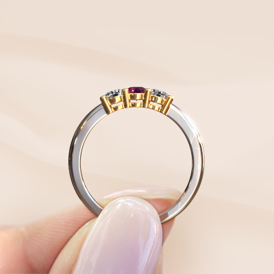This extraordinary ring is called Michelle 3. This type of ring is known as a memoire ring, because its gemstones are set in a continuous line. This makes it easy to combine with other rings. The band of this 14 Carat white gold ring is set in a combination of rhodolite and lab grown diamond 3.7 mm. You can easily choose the combination you prefer online. As you can see, a single rhodolite is set in this single alliance white gold ring. The memoire ring represents collaboration. And that is precisely what these gemstones do, collaborate. Together they add a beautiful effect to the band of a classic ring! Such a meaningful ring, wouldn't you agree? All our hand selected rhodolite are positioned by hand by our expert goldsmith. It's a precise task, which can only be completed successfully through the combination of pure craftsmanship and usage of the latest techniques which give it an optimal effect. To create a perfect reflection of light, all the gemstones have to be perfectly aligned in the same way. During manufacturing, the expert goldsmith will therefore monitor the reflection of light constantly to check whether the rhodolite are aligned properly. This requires a skilled hand and a lot of patience but then the end product will be a true piece of art. And that is our mission!Are you on a budget? Please feel free to contact us, so we can go discuss your options. We offer our rings at guaranteed best price, because we make them to order. You won't find such a price anywhere else!