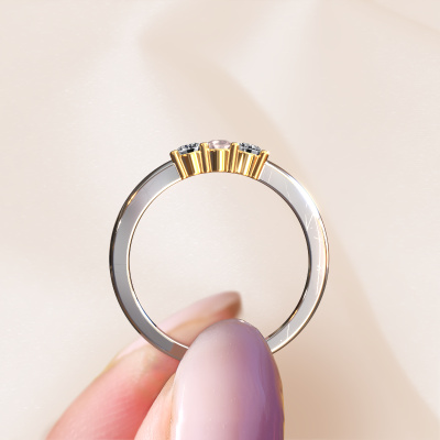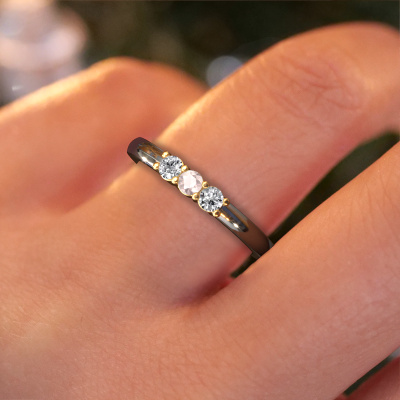 This extraordinary ring is called Yasmin 3. This type of ring is known as a memoire ring, because its gemstones are set in a continuous line. This makes it easy to combine with other rings. The band of this 14 Carat white gold ring is set in a combination of morganite champagne and blue topaz 3 mm. You can easily choose the combination you prefer online. As you can see, a single morganite champagne is set in this single alliance white gold ring. The memoire ring represents collaboration. And that is precisely what these gemstones do, collaborate. Together they add a beautiful effect to the band of a classic ring! Such a meaningful ring, wouldn't you agree? All our hand selected morganite champagne are positioned by hand by our expert goldsmith. It's a precise task, which can only be completed successfully through the combination of pure craftsmanship and usage of the latest techniques which give it an optimal effect. To create a perfect reflection of light, all the gemstones have to be perfectly aligned in the same way. During manufacturing, the expert goldsmith will therefore monitor the reflection of light constantly to check whether the morganite champagne are aligned properly. This requires a skilled hand and a lot of patience but then the end product will be a true piece of art. And that is our mission!