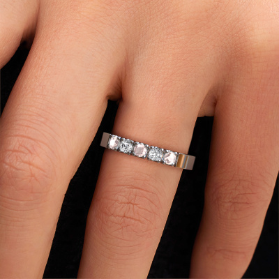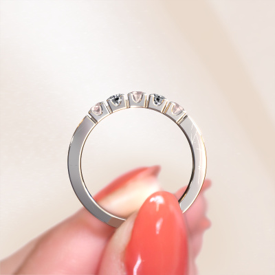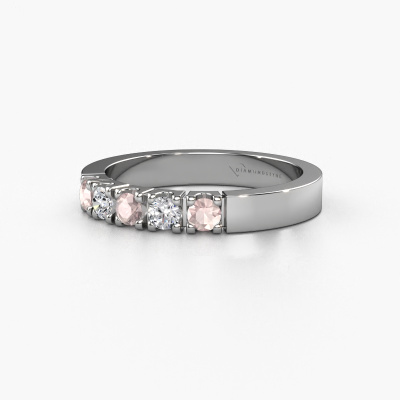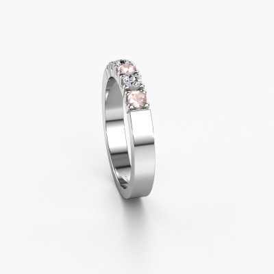 This extraordinary ring is called Dana 5. This type of ring is known as a memoire ring, because its gemstones are set in a continuous line. This makes it easy to combine with other rings. The band of this platinum ring is set in a combination of morganite champagne and diamond 3 mm. You can easily choose the combination you prefer online. As you can see, a single morganite champagne is set in this single alliance platinum ring. The memoire ring represents collaboration. And that is precisely what these gemstones do, collaborate. Together they add a beautiful effect to the band of a modern ring! Such a meaningful ring, wouldn't you agree? All our hand selected morganite champagne are positioned by hand by our expert goldsmith. It's a precise task, which can only be completed successfully through the combination of pure craftsmanship and usage of the latest techniques which give it an optimal effect. To create a perfect reflection of light, all the gemstones have to be perfectly aligned in the same way. During manufacturing, the expert goldsmith will therefore monitor the reflection of light constantly to check whether the morganite champagne are aligned properly. This requires a skilled hand and a lot of patience but then the end product will be a true piece of art. And that is our mission!