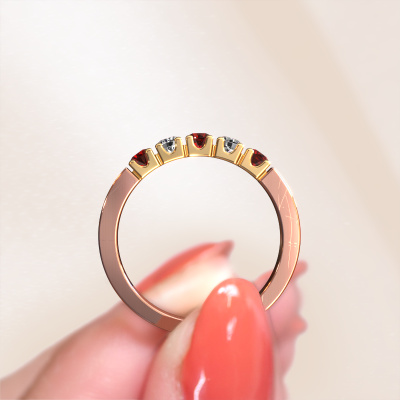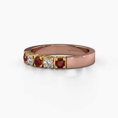 This extraordinary ring is called Dana 5. This type of ring is known as a memoire ring, because its gemstones are set in a continuous line. This makes it easy to combine with other rings. The band of this 14 Carat rose gold ring is set in a combination of garnet and diamond 3 mm. You can easily choose the combination you prefer online. As you can see, a single garnet is set in this single alliance rose gold ring. The memoire ring represents collaboration. And that is precisely what these gemstones do, collaborate. Together they add a beautiful effect to the band of a modern ring! Such a meaningful ring, wouldn't you agree? All our hand selected garnet are positioned by hand by our expert goldsmith. It's a precise task, which can only be completed successfully through the combination of pure craftsmanship and usage of the latest techniques which give it an optimal effect. To create a perfect reflection of light, all the gemstones have to be perfectly aligned in the same way. During manufacturing, the expert goldsmith will therefore monitor the reflection of light constantly to check whether the garnet are aligned properly. This requires a skilled hand and a lot of patience but then the end product will be a true piece of art. And that is our mission!Because we design and deliver our own rings, we can offer you a ring at a price you won't find anywhere else. A ring is made to order, which helps prevent excess supplies, so we can make you a great price offer. We understand it feels risky, buying your ring online, but we will gladly assist in the designing process, taking your budget into consideration.New jewellery designs are added to our online collection daily. Our team of passionate designers strive to create extraordinary and diverse designs. Have you seen a ring you like? Please feel free to contact us. Based on a good price/ quality ratio, we will make you an offer you can't refuse!To make it easier for you, we offer a 30 day return policy. Check our terms and conditions.