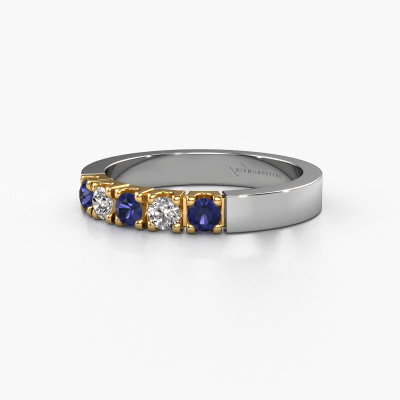 This extraordinary ring is called Dana 5. This type of ring is known as a memoire ring, because its gemstones are set in a continuous line. This makes it easy to combine with other rings. The band of this 14 Carat white gold ring is set in a combination of sapphire and diamond 3 mm. You can easily choose the combination you prefer online. As you can see, a single sapphire is set in this single alliance white gold ring. The memoire ring represents collaboration. And that is precisely what these gemstones do, collaborate. Together they add a beautiful effect to the band of a modern ring! Such a meaningful ring, wouldn't you agree? All our hand selected sapphire are positioned by hand by our expert goldsmith. It's a precise task, which can only be completed successfully through the combination of pure craftsmanship and usage of the latest techniques which give it an optimal effect. To create a perfect reflection of light, all the gemstones have to be perfectly aligned in the same way. During manufacturing, the expert goldsmith will therefore monitor the reflection of light constantly to check whether the sapphire are aligned properly. This requires a skilled hand and a lot of patience but then the end product will be a true piece of art. And that is our mission!Because we design and deliver our own rings, we can offer you a ring at a price you won't find anywhere else. A ring is made to order, which helps prevent excess supplies, so we can make you a great price offer. We understand it feels risky, buying your ring online, but we will gladly assist in the designing process, taking your budget into consideration.New jewellery designs are added to our online collection daily. Our team of passionate designers strive to create extraordinary and diverse designs. Have you seen a ring you like? Please feel free to contact us. Based on a good price/ quality ratio, we will make you an offer you can't refuse!To make it easier for you, we offer a 30 day return policy. Check our terms and conditions.