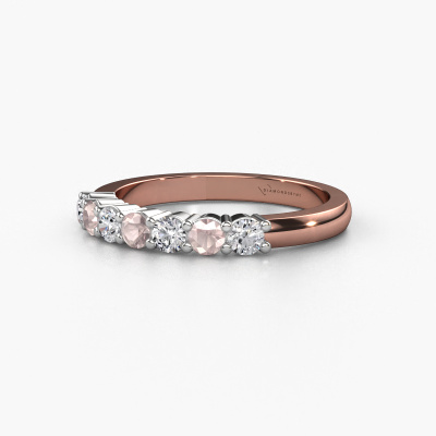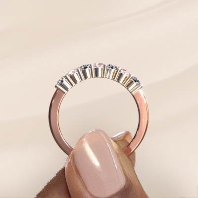 This extraordinary ring is called Yasmin 7. This type of ring is known as a memoire ring, because its gemstones are set in a continuous line. This makes it easy to combine with other rings. The band of this 14 Carat rose gold ring is set in a combination of morganite champagne and lab grown diamond 2.7 mm. You can easily choose the combination you prefer online. As you can see, a single morganite champagne is set in this single alliance rose gold ring. The memoire ring represents collaboration. And that is precisely what these gemstones do, collaborate. Together they add a beautiful effect to the band of a classic ring! Such a meaningful ring, wouldn't you agree? All our hand selected morganite champagne are positioned by hand by our expert goldsmith. It's a precise task, which can only be completed successfully through the combination of pure craftsmanship and usage of the latest techniques which give it an optimal effect. To create a perfect reflection of light, all the gemstones have to be perfectly aligned in the same way. During manufacturing, the expert goldsmith will therefore monitor the reflection of light constantly to check whether the morganite champagne are aligned properly. This requires a skilled hand and a lot of patience but then the end product will be a true piece of art. And that is our mission!