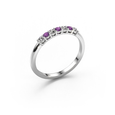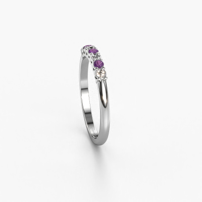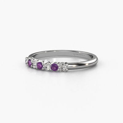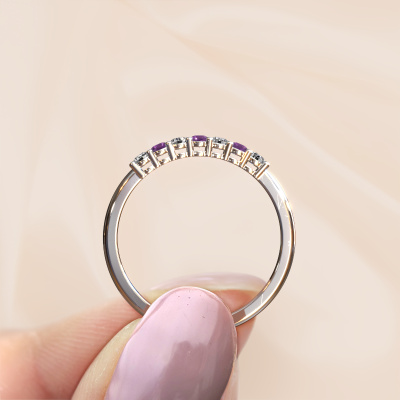 This extraordinary ring is called Michelle 7. This type of ring is known as a memoire ring, because its gemstones are set in a continuous line. This makes it easy to combine with other rings. The band of this 14 Carat white gold ring is set in a combination of amethyst and diamond 2 mm. You can easily choose the combination you prefer online. As you can see, a single amethyst is set in this single alliance white gold ring. The memoire ring represents collaboration. And that is precisely what these gemstones do, collaborate. Together they add a beautiful effect to the band of a classic ring! Such a meaningful ring, wouldn't you agree? All our hand selected amethysten are positioned by hand by our expert goldsmith. It's a precise task, which can only be completed successfully through the combination of pure craftsmanship and usage of the latest techniques which give it an optimal effect. To create a perfect reflection of light, all the gemstones have to be perfectly aligned in the same way. During manufacturing, the expert goldsmith will therefore monitor the reflection of light constantly to check whether the amethysten are aligned properly. This requires a skilled hand and a lot of patience but then the end product will be a true piece of art. And that is our mission!After receiving your order, our goldsmiths will passionately start the creative process of making your ring in our own studio. Because we don't have a big stockpile, these costs will not be passed on to you. Our pricing is proof of that! We offer top quality jewels at lowest price, guaranteed.