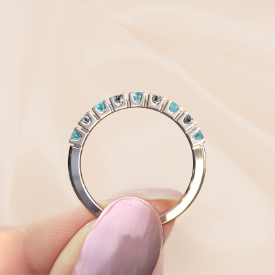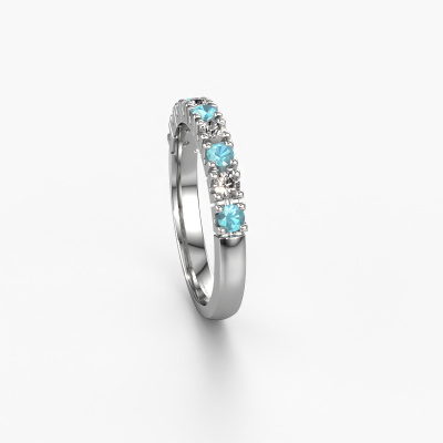 This extraordinary ring is called Rianne 9. This type of ring is known as a memoire ring, because its gemstones are set in a continuous line. This makes it easy to combine with other rings. The band of this platinum ring is set in a combination of blue topaz and diamond 2.4 mm. You can easily choose the combination you prefer online. As you can see, a single blue topaz is set in this single alliance platinum ring. The memoire ring represents collaboration. And that is precisely what these gemstones do, collaborate. Together they add a beautiful effect to the band of a classic ring! Such a meaningful ring, wouldn't you agree? All our hand selected blue topaz are positioned by hand by our expert goldsmith. It's a precise task, which can only be completed successfully through the combination of pure craftsmanship and usage of the latest techniques which give it an optimal effect. To create a perfect reflection of light, all the gemstones have to be perfectly aligned in the same way. During manufacturing, the expert goldsmith will therefore monitor the reflection of light constantly to check whether the blue topaz are aligned properly. This requires a skilled hand and a lot of patience but then the end product will be a true piece of art. And that is our mission!Are you on a budget? Please feel free to contact us, so we can go discuss your options. We offer our rings at guaranteed best price, because we make them to order. You won't find such a price anywhere else!