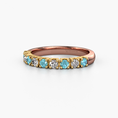 This extraordinary ring is called Rianne 9. This type of ring is known as a memoire ring, because its gemstones are set in a continuous line. This makes it easy to combine with other rings. The band of this 14 Carat rose gold ring is set in a combination of blue topaz and diamond 2.4 mm. You can easily choose the combination you prefer online. As you can see, a single blue topaz is set in this single alliance rose gold ring. The memoire ring represents collaboration. And that is precisely what these gemstones do, collaborate. Together they add a beautiful effect to the band of a classic ring! Such a meaningful ring, wouldn't you agree? All our hand selected blue topaz are positioned by hand by our expert goldsmith. It's a precise task, which can only be completed successfully through the combination of pure craftsmanship and usage of the latest techniques which give it an optimal effect. To create a perfect reflection of light, all the gemstones have to be perfectly aligned in the same way. During manufacturing, the expert goldsmith will therefore monitor the reflection of light constantly to check whether the blue topaz are aligned properly. This requires a skilled hand and a lot of patience but then the end product will be a true piece of art. And that is our mission!Are you on a budget? Please feel free to contact us, so we can go discuss your options. We offer our rings at guaranteed best price, because we make them to order. You won't find such a price anywhere else!