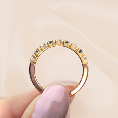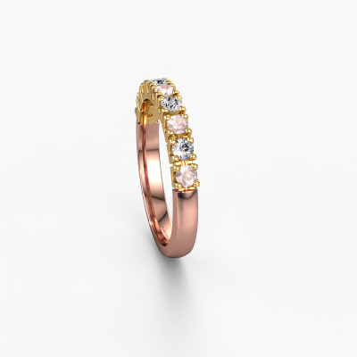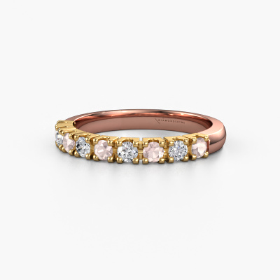 This extraordinary ring is called Rianne 9. This type of ring is known as a memoire ring, because its gemstones are set in a continuous line. This makes it easy to combine with other rings. The band of this 14 Carat rose gold ring is set in a combination of morganite champagne and diamond 2.4 mm. You can easily choose the combination you prefer online. As you can see, a single morganite champagne is set in this single alliance rose gold ring. The memoire ring represents collaboration. And that is precisely what these gemstones do, collaborate. Together they add a beautiful effect to the band of a classic ring! Such a meaningful ring, wouldn't you agree? All our hand selected morganite champagne are positioned by hand by our expert goldsmith. It's a precise task, which can only be completed successfully through the combination of pure craftsmanship and usage of the latest techniques which give it an optimal effect. To create a perfect reflection of light, all the gemstones have to be perfectly aligned in the same way. During manufacturing, the expert goldsmith will therefore monitor the reflection of light constantly to check whether the morganite champagne are aligned properly. This requires a skilled hand and a lot of patience but then the end product will be a true piece of art. And that is our mission!