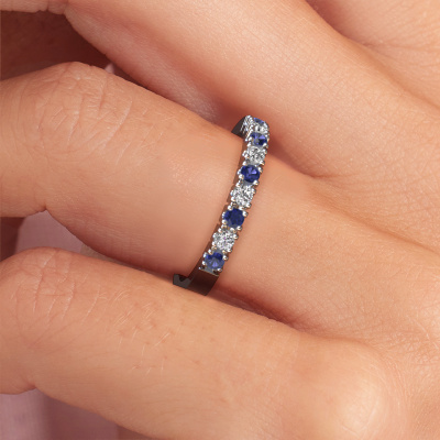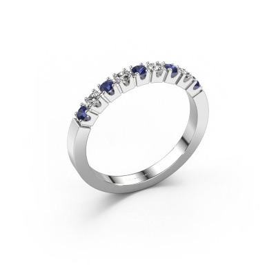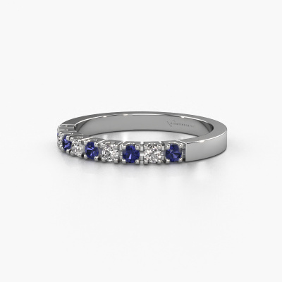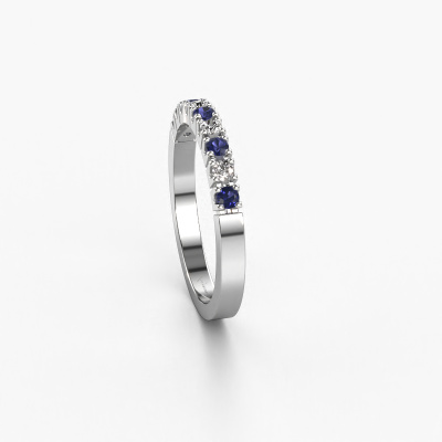 This extraordinary ring is called Dana 9. This type of ring is known as a memoire ring, because its gemstones are set in a continuous line. This makes it easy to combine with other rings. The band of this 14 Carat white gold ring is set in a combination of sapphire and diamond 2 mm. You can easily choose the combination you prefer online. As you can see, a single sapphire is set in this single alliance white gold ring. The memoire ring represents collaboration. And that is precisely what these gemstones do, collaborate. Together they add a beautiful effect to the band of a modern ring! Such a meaningful ring, wouldn't you agree? All our hand selected sapphire are positioned by hand by our expert goldsmith. It's a precise task, which can only be completed successfully through the combination of pure craftsmanship and usage of the latest techniques which give it an optimal effect. To create a perfect reflection of light, all the gemstones have to be perfectly aligned in the same way. During manufacturing, the expert goldsmith will therefore monitor the reflection of light constantly to check whether the sapphire are aligned properly. This requires a skilled hand and a lot of patience but then the end product will be a true piece of art. And that is our mission!After receiving your order, our goldsmiths will passionately start the creative process of making your ring in our own studio. Because we don't have a big stockpile, these costs will not be passed on to you. Our pricing is proof of that! We offer top quality jewels at lowest price, guaranteed.Our talented designers add new designs to our online collection daily. Together they create a diverse collection of the finest jewellery. If you prefer to make a ring according your own design, please feel free to request a quote. We will make you an amazing offer, based on quality and price.To make it easier for you, we offer a 30 day return policy. Check our terms and conditions.