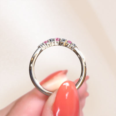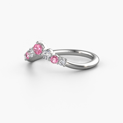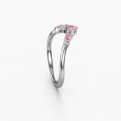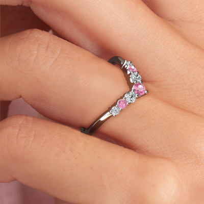 This Imani B stackable ring in 14 Carat white gold is set with pink sapphire. This white gold stacked Imani B ring is the perfect addition to your ring collection! As the name suggests, it is a ring which can be combined on one finger with another ring. It gives you the opportunity to create your own style. A stacked ring usually represents a certain memory of someone special or a memorable moment. It is common to combine a stacked ring, representing an anniversary, with a wedding ring. But this beautiful ring, combined with your other rings, also makes a classy fashion item. Our goldsmiths passionately create your customized stackable ring to your liking with the utmost care. The white gold stackable ring, as shown here, can be customized using our online tool. Feel free to ask our jewel designers for assistance if you want changes made which are unavailable in our online tool. We are happy to answer your questions.By using a combination of the latest modern techniques, combined with ancient crafting, we can make all our rings in our own studio. Each jewel is made to order. This is advantageous because we can offer you a price you won't find anywhere else.To make it easier for you, we offer a 30 day return policy. Check our terms and conditions.