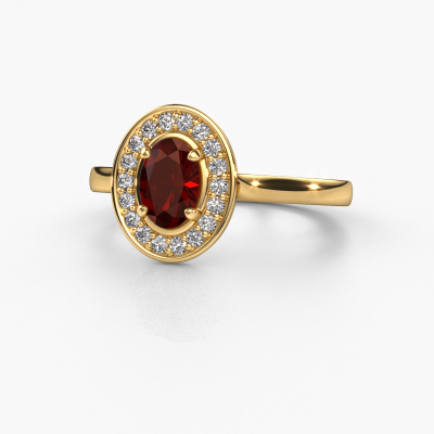 The ring shown above is called Madelon 1. This type of ring is known as a solitaire ring. The 14 Carat gold ring is set with a 7x5 mm oval garnet centre stone surrounded by smaller sized diamonds. This best price gold halo ring, is set with a big garnet embraced by smaller sized gemstones. The ring got its name for its halo which the smaller sized diamonds help create. In order to achieve a stunning halo, these smaller sized gemstones have to be aligned perfectly so light reflects evenly on the garnet from every angle. And our expert goldsmiths get the job done. Each carefully selected garnet is set by hand with utmost precision. During manufacturing, light fall is constantly monitored to make sure the special halo effect is still visible. In the end you get a unique ring with a radiant garnet gemstone centrepiece. An exquisite ring indeed! The best part of this best price ring is that you can customize it to your own liking. Your style, your choice, your ring. On top of that, your classic gold ring will be made by hand with eco-friendly materials! Please feel free to easily customize the ring, using our online tool.Are you on a budget? Please feel free to contact us, so we can go discuss your options. We offer our rings at guaranteed best price, because we make them to order. You won't find such a price anywhere else!To make it easier for you, we offer a 30 day return policy. Check our terms and conditions.
