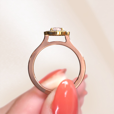 The ring shown above is called Madelon 1. This type of ring is known as a solitaire ring. The 14 Carat rose gold ring is set with a 7x5 mm oval morganite champagne centre stone surrounded by smaller sized diamonds. This best price rose gold halo ring, is set with a big morganite champagne embraced by smaller sized gemstones. The ring got its name for its halo which the smaller sized diamonds help create. In order to achieve a stunning halo, these smaller sized gemstones have to be aligned perfectly so light reflects evenly on the morganite champagne from every angle. And our expert goldsmiths get the job done. Each carefully selected morganite champagne is set by hand with utmost precision. During manufacturing, light fall is constantly monitored to make sure the special halo effect is still visible. In the end you get a unique ring with a radiant morganite champagne gemstone centrepiece. An exquisite ring indeed! The best part of this best price ring is that you can customize it to your own liking. Your style, your choice, your ring. On top of that, your classic rose gold ring will be made by hand with eco-friendly materials! Please feel free to easily customize the ring, using our online tool.Are you on a budget? Please feel free to contact us, so we can go discuss your options. We offer our rings at guaranteed best price, because we make them to order. You won't find such a price anywhere else!To make it easier for you, we offer a 30 day return policy. Check our terms and conditions.