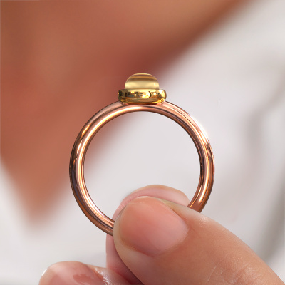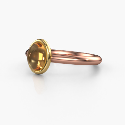 In this photo the rose gold Blossom OVL 2 ring is set with a cabochon citrin. Cabochon means a citrin is shaped first, not faceted, into a specific shape, such as a drop, heart or oval cabochon. Subsequently, it is polished until the gemstone has a orb shaped surface. A cabochon gemstone is a stunning, classy eye-catcher that matches perfectly with a contemporary as well as a vintage style. Our expert goldsmiths shape the fashionable ring to perfection which makes it unique. The cabochon citrin is set so its unique qualities are strengthened. The fashionable Blossom OVL 2 ring, as shown here, can be customized to your liking. Our online tool offers many different options but please feel free to contact us if you want changes made to your Blossom OVL 2 ring, which are unavailable in our online tool.After receiving your order, our goldsmiths will passionately start the creative process of making your ring in our own studio. Because we don't have a big stockpile, these costs will not be passed on to you. Our pricing is proof of that! We offer top quality jewels at lowest price, guaranteed.To make it easier for you, we offer a 30 day return policy. Check our terms and conditions.