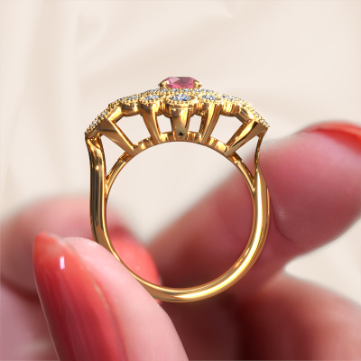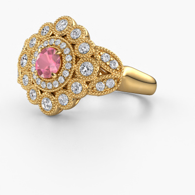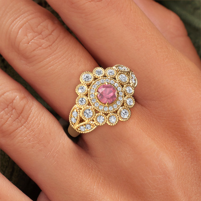 Do you have a vintage fetish? Then this gold Elia ring suits you perfectly. It's a contemporary design, based on vintage designs. A slightly romantic, extraordinary design! Even more when you customize to your liking. This cluster ring is set with exquisite tourmaline pink. As you can see, you can simply choose a gemstone that matches your style. Each gemstone is carefully selected by our merchants whom are spread throughout the world. Nothing but the best gems for our expert goldsmith! After all, it is his crowning glory!Our goldsmiths passionately create your customized ring to your liking with the utmost care. The gold ring, as shown here, can be customized using our online tool. Feel free to ask our jewel designers for assistance if you want changes made which are unavailable in our online tool. We are happy to answer your questions.Because we design and deliver our own rings, we can offer you a ring at a price you won't find anywhere else. A ring is made to order, which helps prevent excess supplies, so we can make you a great price offer. We understand it feels risky, buying your ring online, but we will gladly assist in the designing process, taking your budget into consideration.To make it easier for you, we offer a 30 day return policy. Check our terms and conditions.