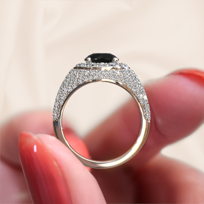 This pave set ring is called Dayle. This 14 Carat white gold ring is set with black diamonds 2.963 crt. The band of this white gold ring is set with rows of black diamonds which seem to have no beginning nor end. Our goldsmith carefully selects the gemstones and sets them with the utmost precision. For maximum shine, the black diamonds have to align perfectly. While artfully crafting and polishing the jewellery, light fall is constantly monitored, until the expert goldsmith is satisfied with the result. Designed by you, created especially for you!The best part of this elegant ring is that you can customize it to your own liking. Your style, your choice, your ring. On top of that, your exclusive white gold ring will be made by hand with eco-friendly materials! Please feel free to easily customize the ring, using our online tool.Are you on a budget? Please feel free to contact us, so we can go discuss your options. We offer our rings at guaranteed best price, because we make them to order. You won't find such a price anywhere else!To make it easier for you, we offer a 30 day return policy. Check our terms and conditions.