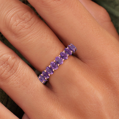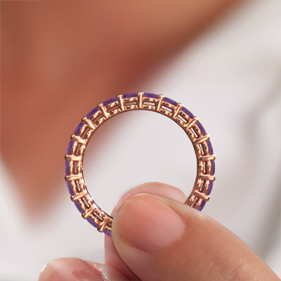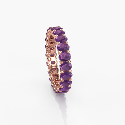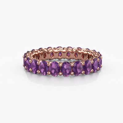 This is our Heddy OVL 3x4 ring. This specific type is called an eternity ring and it is set with a continuous line of identically cut gemstones. The ring is made in 14 Carat rose gold and is set with small amethysten, 4x3 mm. This rose gold Eternity ring is a perfectly beautiful and meaningful way to give your proposal that special touch. The magnificent evenly shaped amethysten are pave set around the ring. The identical amethysten are carefully selected to give the ring a maximum effect. Do keep in mind we use natural resources so small differences between stones are common. The special effect is enhanced due to precise positioning of the amethysten. This requires the utmost precision and a skilful hand but for our skilled artisans this is what excites them. The result is a stackable ring with a row of amethysten which seem to have no beginning nor end. The perfect symbol of your love for her! Isn't she a beauty?After receiving your order, our goldsmiths will start the creative process of making your Heddy OVL 3x4 ring. We don't keep stock. This is advantageous because these costs will not be passed on to you. Therefore, we can offer jewellery at exceptionally low prices.